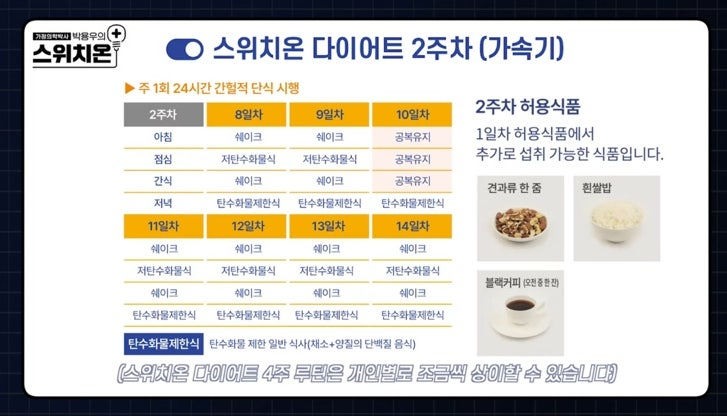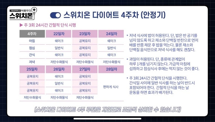 4주차는 3주차와 동일한 식단 구성에 간헐적 단식 횟수를 주 3회로 늘려 진행합니다.