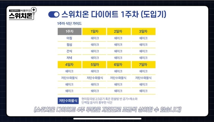 다이어트는 식단이 핵심! 오늘은 최근 인기 급상승 중인 스위치온 다이어트의 4주 루틴 식단표를 자세히 정리했습니다. 한눈에 보기 쉽게 구성했으니 참고하셔서 건강한 다이어트 시작해 보세요!