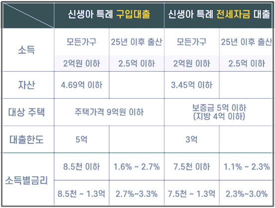 소득 기준이 2억 5천만 원 이하로 엄청나게 조건이 완화됐습니다. 고소득자도 저금리로 신생아 특례대출을 받을 수 있습니다.