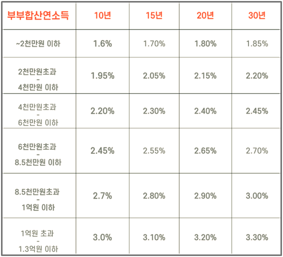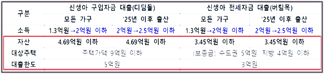 부부의 소득을 합산한 금액이 1억 3천 이하인 경우만 신청가능했는데 올해 하반기부터는 2억, 내년 2025년 1월 1일부터 3년간 아이를 출산한 가구는 연소득이 2억 5천만 원 이하라면 신청 가능합니다.(3년 동안 시행 예정)