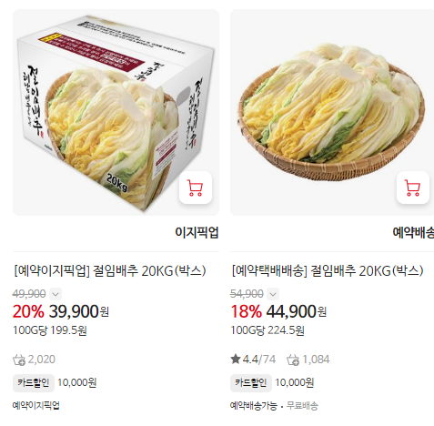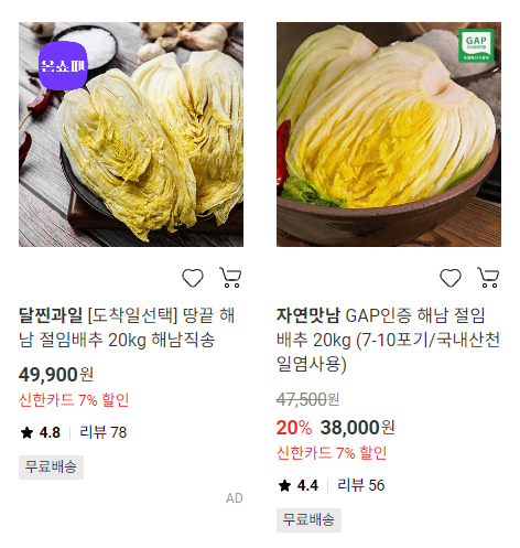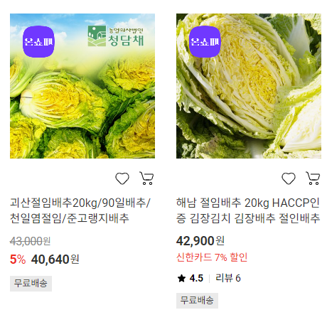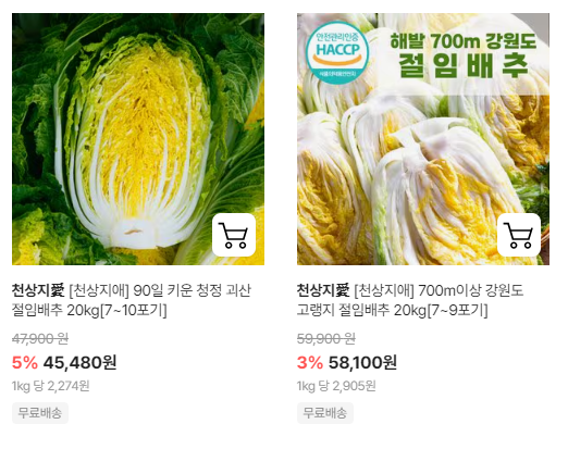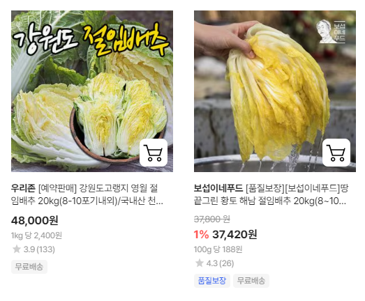 4. 다양한 선택지: 산지별로 고랭지 배추, 해남 배추 등 원하는 품질의 배추를 고를 수 있습니다.