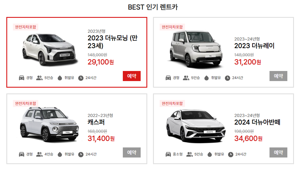 23년형 모닝의 24시간 요금이 29,100원으로, 완전 자차를 포함한 가격이라는 점에서 정말 매력적인 선택이 될 수 있습니다.