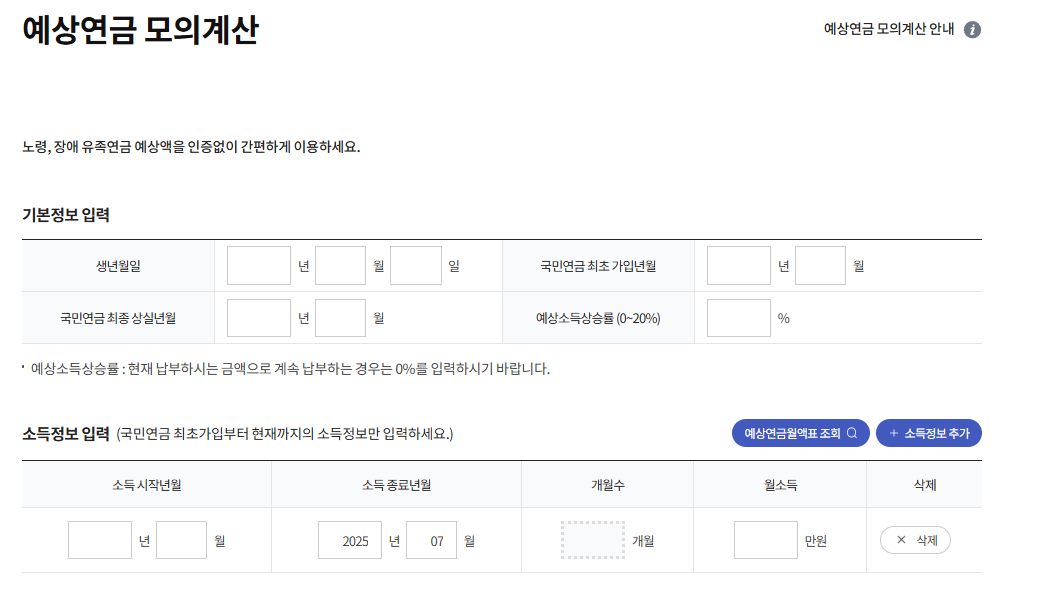 그래서 내가 연금공단에 내는 돈으로 얼마나 받을 수 있는지 나의 예상 국민연금이 궁금하시다면 아래의 예상연금 모의계산을 통해 알아보실수 있습니다.