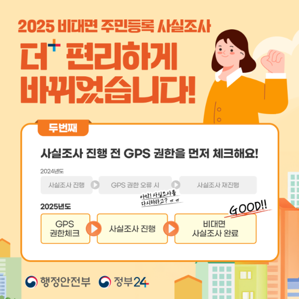 앱을 실행하면 상단에 '2025년 주민등록 사실조사' 배너가 보일 거예요. 이 배너를 누르면 자동으로 안내 페이지로 이동합니다. - 3. 본인 인증 및 GPS 권한 설정